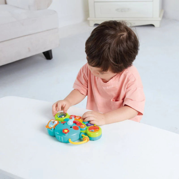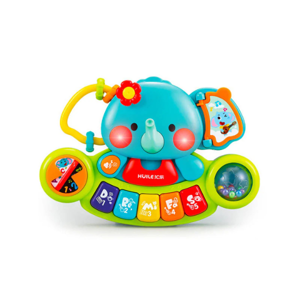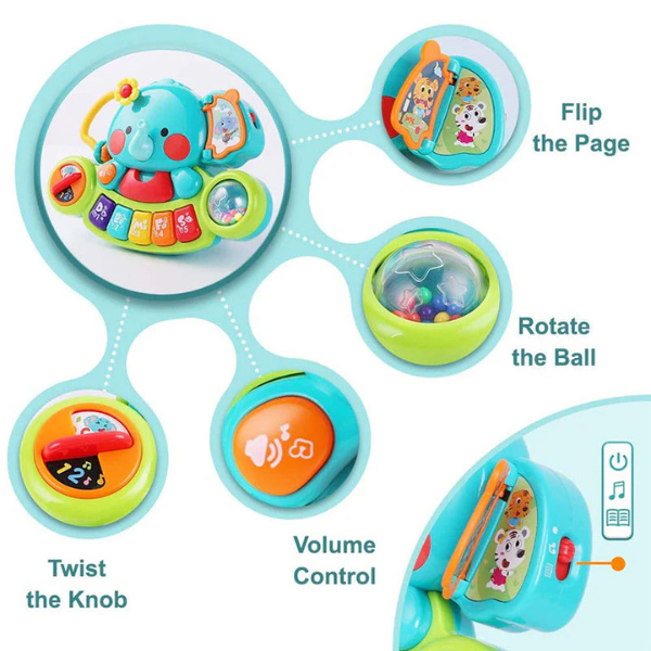The Hola Elephant Keyboard features interactive elements like a flip page, rotating ball, twistable knob, and volume control—perfect for enhancing sensory and motor skills.